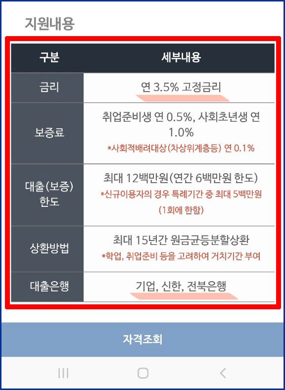 | 지원대상 | 자격조건 | 최장 거치기간 | 최장 상환기간 | 최장 보증기간 |