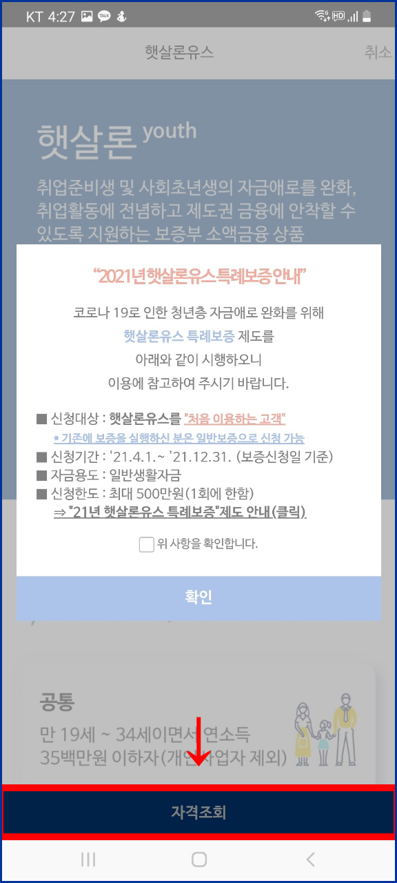 1. 서민금융진흥원 앱을 설치하신 뒤에 회원가입 및 로그인을 해준 뒤에 위의 이미지처럼 메인에 있는 햇살론 유스를 클릭해주시면 됩니다. 이렇게 햇살론 유스에 들어가시면 맨 아래 자격조회가 나오니 바로 조회를 하셔서 햇살론 유스 서류 준비를 하시면 됩니다.