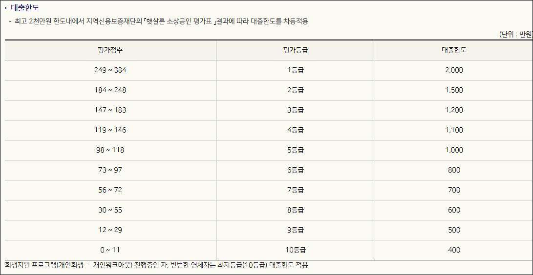 자영업자의 경우 햇살론 소상공인 평가표에 의한 점수별 등급에 따라 차등적용됩니다.