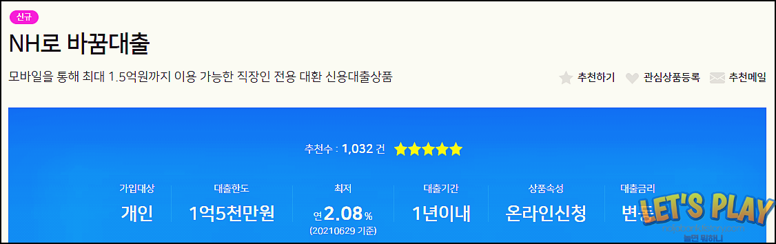 농협에서도 대환대출 상품이 있습니다. 좋은 점은 모바일로 이용을 할 수 있다는 점인데요. 직장인이어야 신청이 가능하지만 자격조건을 만족한다면 저금리로 이용이 가능하다는 장점이 있습니다.